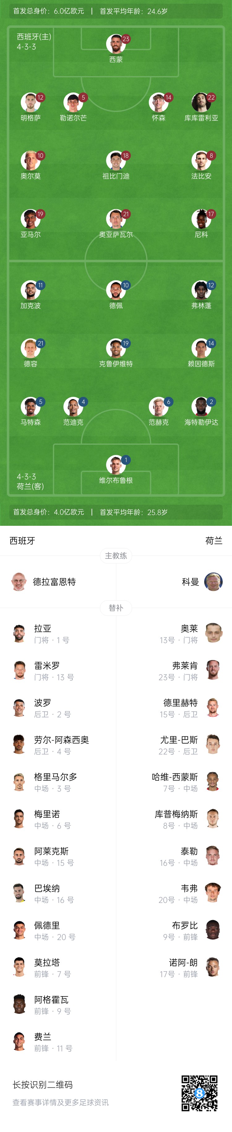 西班牙首發(fā):23-烏奈-西蒙、12-明格薩、5-勒諾爾芒、14-懷森、22-庫(kù)庫(kù)雷利亞、18-祖比門(mén)迪、8-法比安、10-奧爾莫、19-亞馬爾、17-尼科-威廉姆斯、21-奧亞薩瓦爾