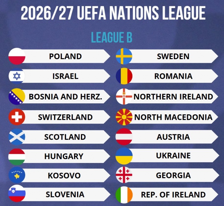 歐國聯(lián)2026-27賽季B級別球隊出爐:蘇格蘭、烏克蘭、波蘭在列