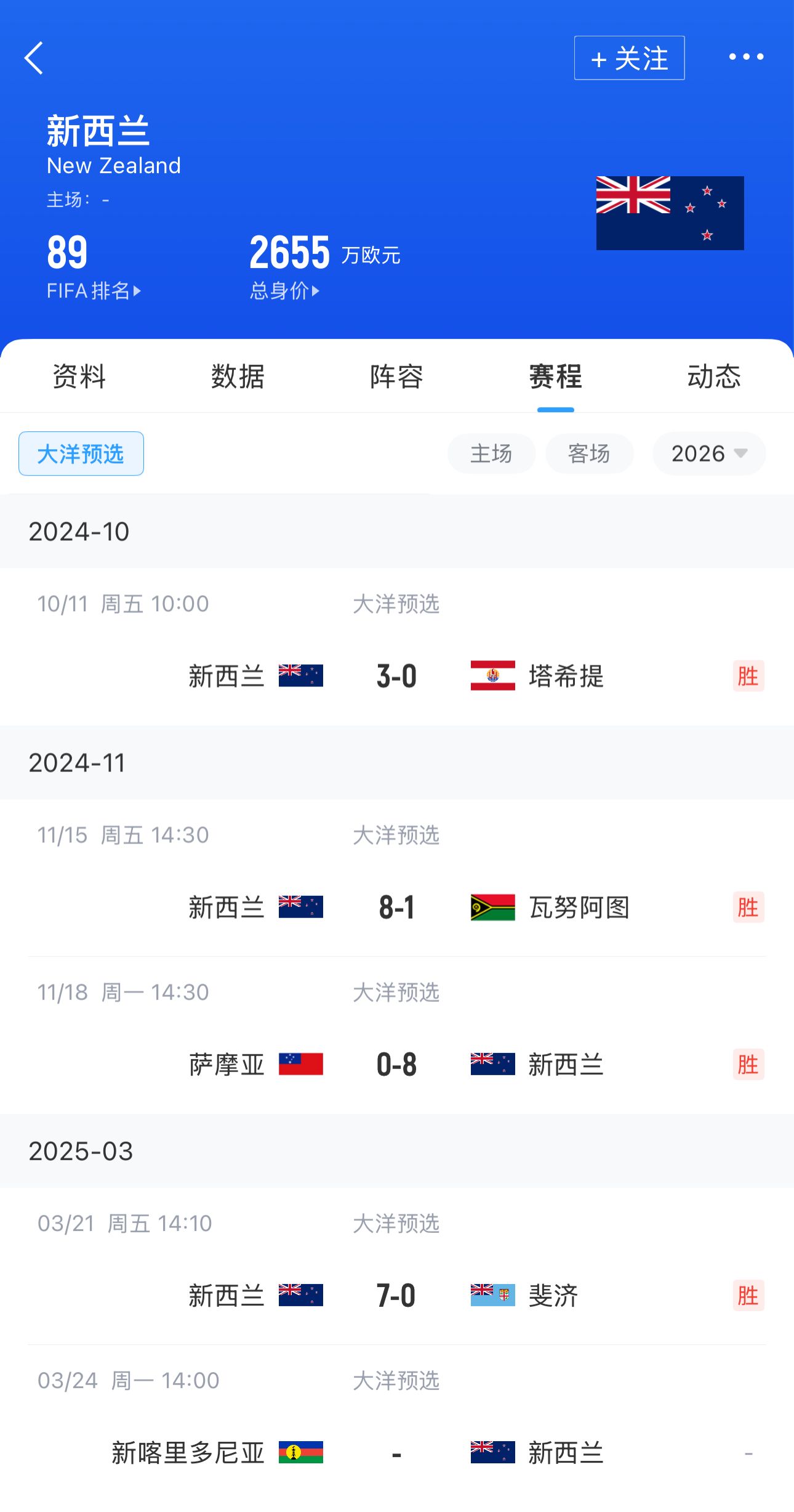 新西蘭FIFA排名第89,只比國(guó)足高1位,陣容身價(jià)2655萬(wàn)歐,本屆預(yù)選賽至今4場(chǎng)打進(jìn)26球只丟1球。