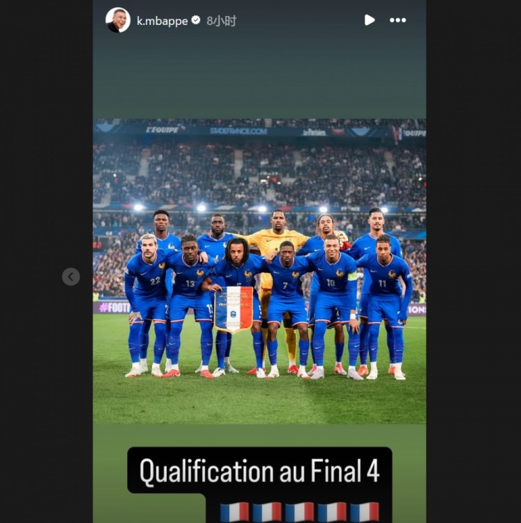 重返法國隊(duì)的姆巴佩在賽后通過社媒曬出全隊(duì)合照,并配文:“晉級(jí)四強(qiáng)!”