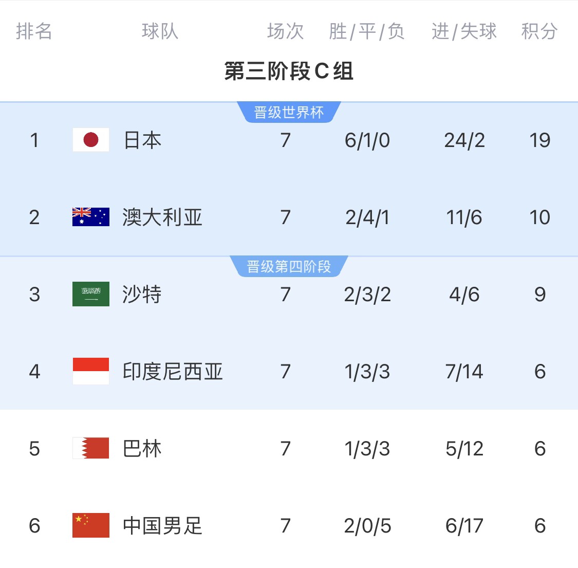 在上輪開打前,澳大利亞雖然排名第2,國(guó)足雖然落入到了墊底位置,可是積分差距只有1分(7-6),彼時(shí)還有不少球迷幻想著接下來的“奇跡”??墒?,在0-1輸給沙特后,國(guó)足仍舊的墊底,澳洲卻痛擊歸化滿滿的印尼,將自己的分?jǐn)?shù)優(yōu)勢(shì)擴(kuò)大,保持了晉級(jí)的主動(dòng)權(quán)。目前他們?nèi)耘f是第2,我們?nèi)耘f是墊底,可晉級(jí)情況卻“天壤之別”了。