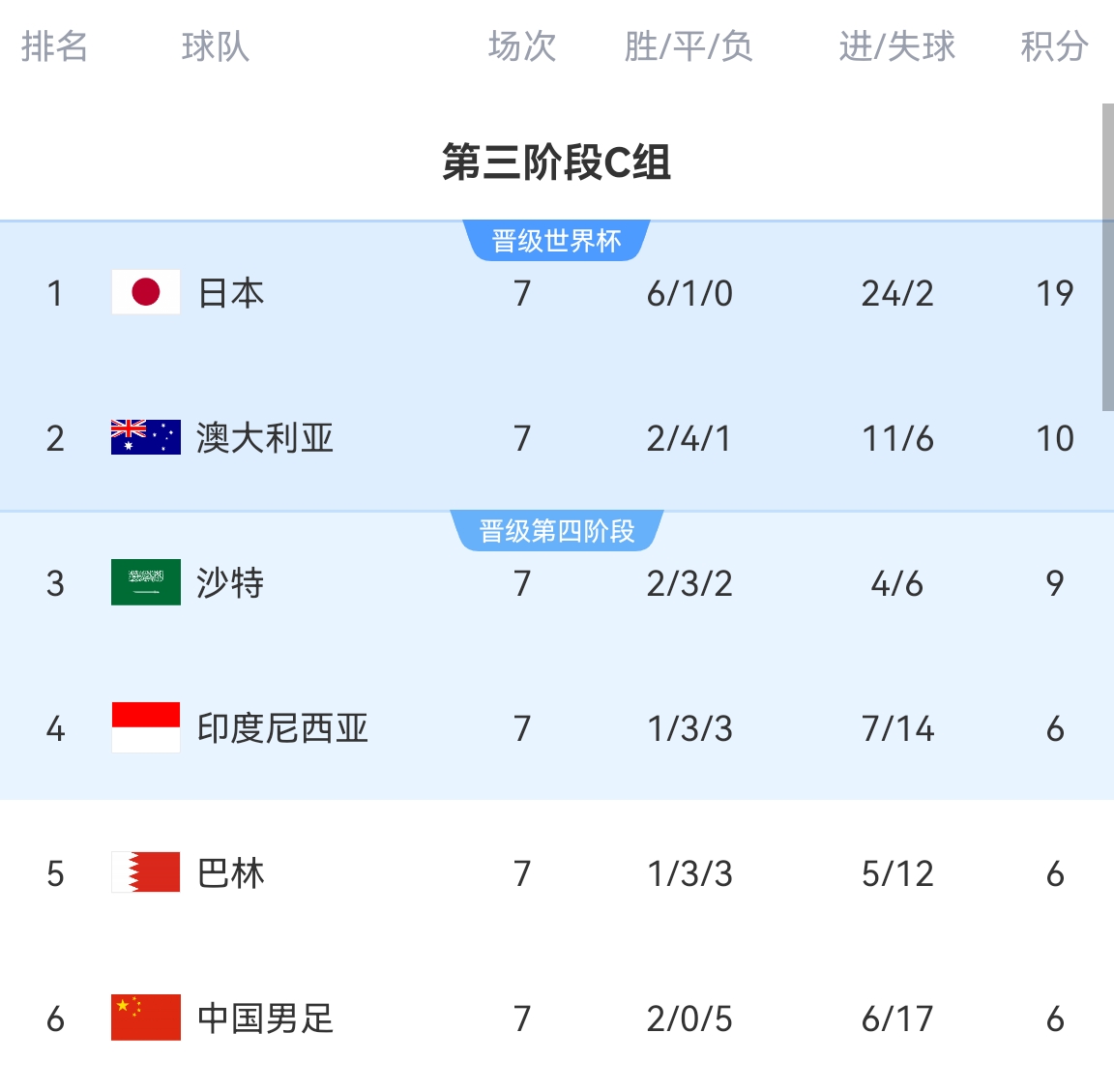 【實(shí)時(shí)更新】國足C組實(shí)時(shí)積分:澳大利亞13分 國足6分凈勝球-13!