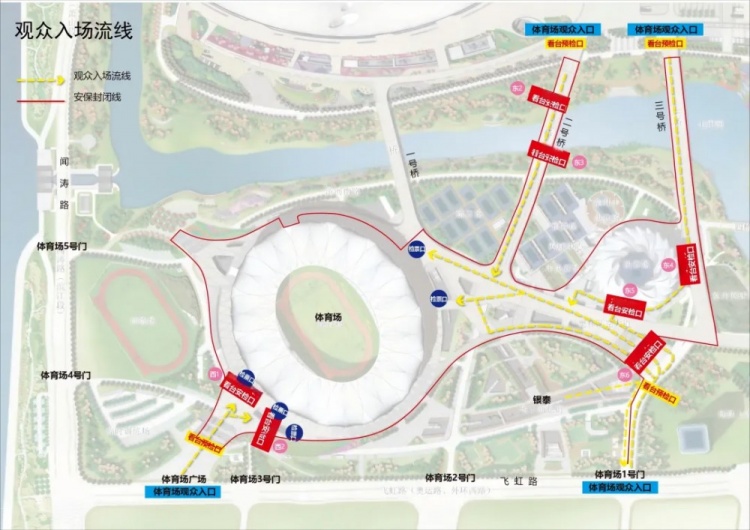 抵達(dá)現(xiàn)場(chǎng)的觀眾,可經(jīng)由 1 號(hào)門、西廣場(chǎng)、2 號(hào)橋以及 3 號(hào)橋前往體育場(chǎng)入口,有序入場(chǎng)。建議龍之隊(duì)、長(zhǎng)城、中國(guó)制躁等有組織的球迷通過3號(hào)橋?qū)S猛ǖ赖竭_(dá)安檢口。