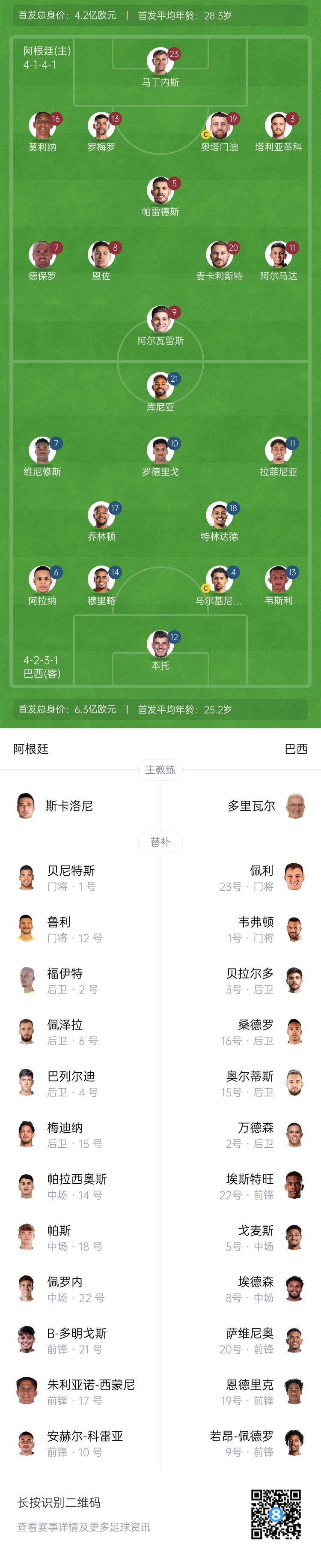 阿根廷首發(fā):23-馬丁內斯、16-莫利納、13-羅梅羅、19-奧塔門迪、3-塔利亞菲科、7-德保羅、5-帕雷德斯、20-麥卡利斯特、8-恩佐、11-阿爾馬達、9-阿爾瓦雷斯