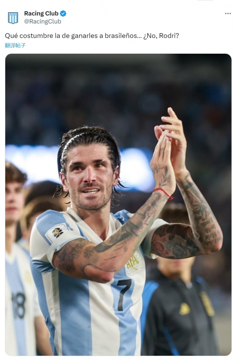阿根廷競(jìng)技俱樂(lè)部社媒曬出自家青訓(xùn)國(guó)腳德保羅的照片,并寫(xiě)道:“擊敗巴西人真是成習(xí)慣了,對(duì)吧,德保羅?”
