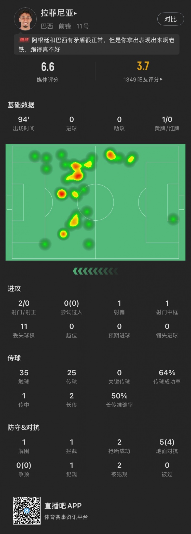 - 白放狠話了?拉菲尼亞本場(chǎng):2射0正1中框,1黃牌,5次對(duì)抗成功4次