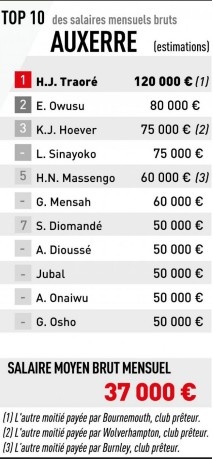 因此,歐塞爾俱樂部(AJA)雖然僅需承擔以下租借球員月薪的一半:由伯恩茅斯租借的科特迪瓦進攻中場哈梅德·朱尼爾·特拉奧雷(25歲,歐賽爾承擔24萬歐元中的12萬)、由狼隊租借的荷蘭右后衛(wèi)基-加納·霍福爾(23歲,歐賽爾承擔15萬歐元中的7.5萬),以及由伯恩利租借的中場漢-諾阿·馬森戈(23歲,歐賽爾承擔12萬歐元中的6萬),馬森戈是合同中唯一包含買斷選項的球員,這個價格也使得這三位球員分別位列俱樂部薪資榜的第一、第三和第五位。