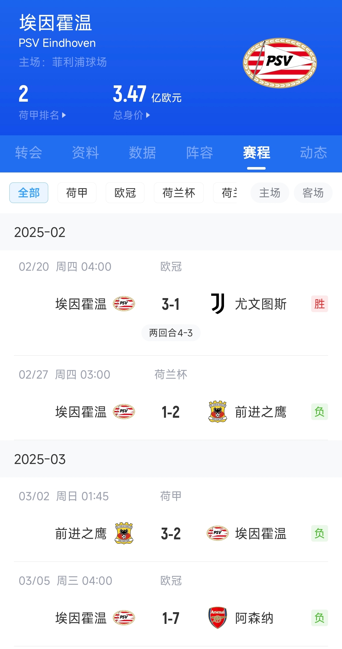 2月27日,埃因霍溫荷蘭杯半決賽1-2不敵前進(jìn)之鷹,無緣決賽。3月2日荷甲聯(lián)賽,埃因霍溫2-3被前進(jìn)之鷹雙殺,荷甲再丟3分,距離榜首阿賈克斯已有8分差距。3月5日凌晨,埃因霍溫歐冠遭遇慘敗1-7不敵阿森納。