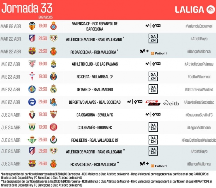 - 西甲第33輪時(shí)間:巴薩、馬競(jìng)的比賽時(shí)間視國(guó)王杯半決賽結(jié)果而定
