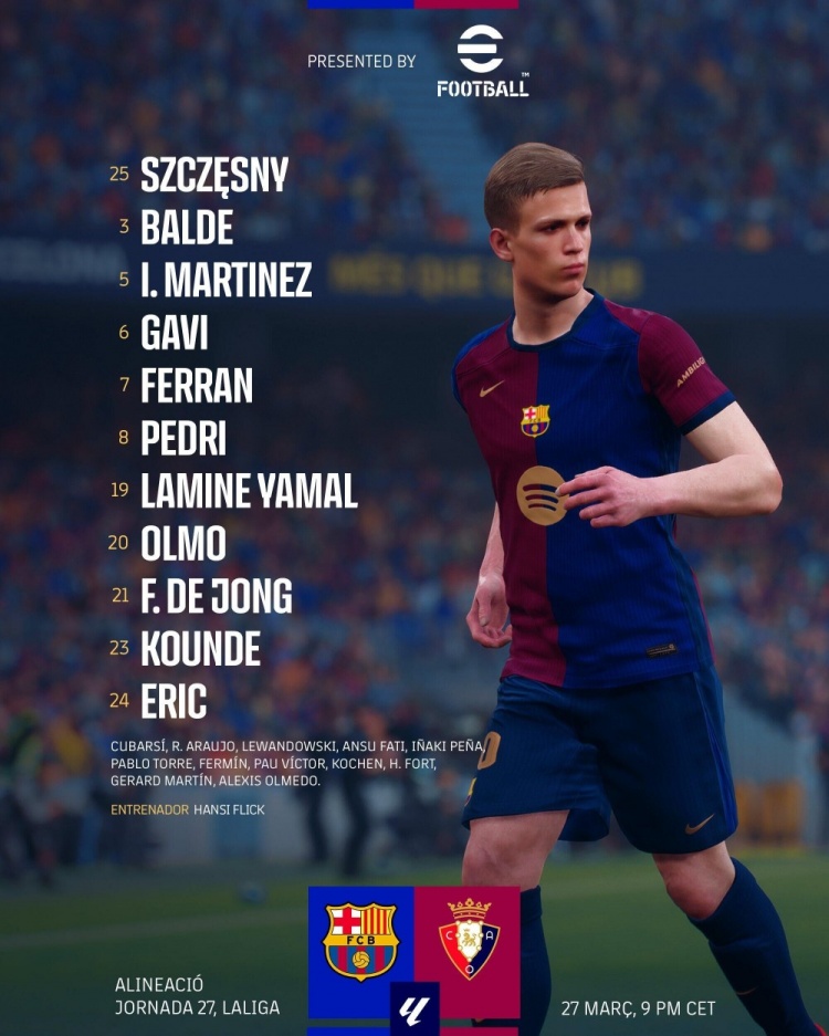 3月28日訊 西甲第27輪補(bǔ)賽,巴薩vs奧薩蘇納首發(fā)出爐。記者Toni Juanmartí談到了本場(chǎng)比賽的首發(fā)陣容。