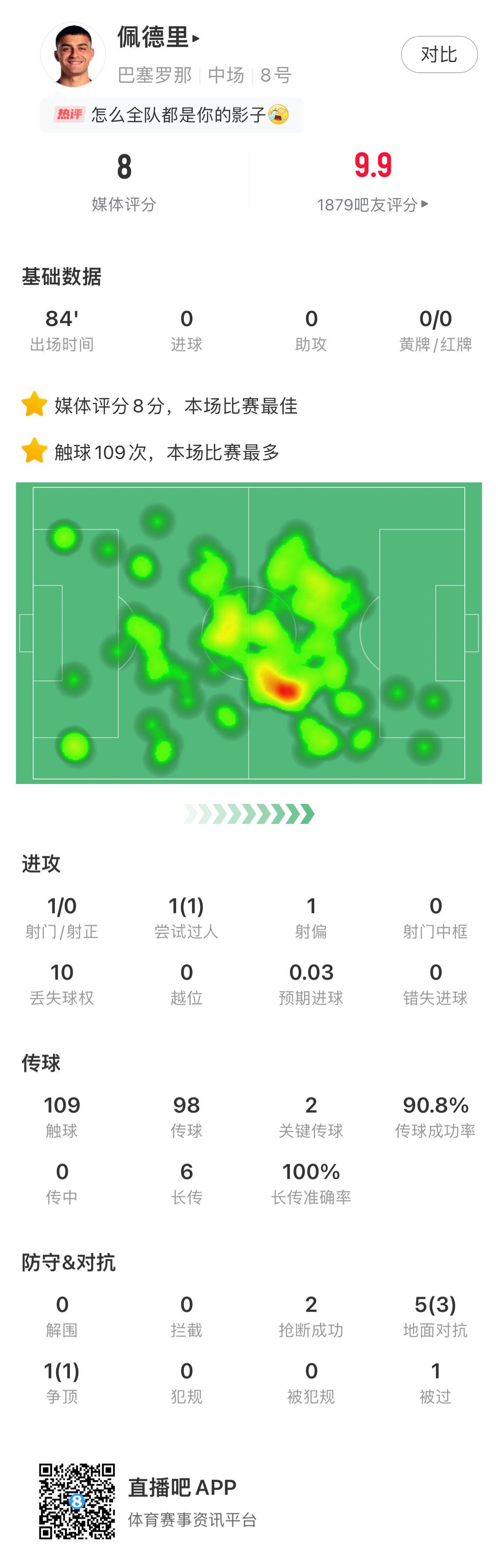03月28日訊 國際比賽日后,巴薩補(bǔ)賽3-0擊敗奧薩蘇納,佩德里延續(xù)“大師級”表現(xiàn),109次觸球,98次傳球90.8%成功率,2次關(guān)鍵傳球,6次長傳100%成功率,2次搶斷成功。