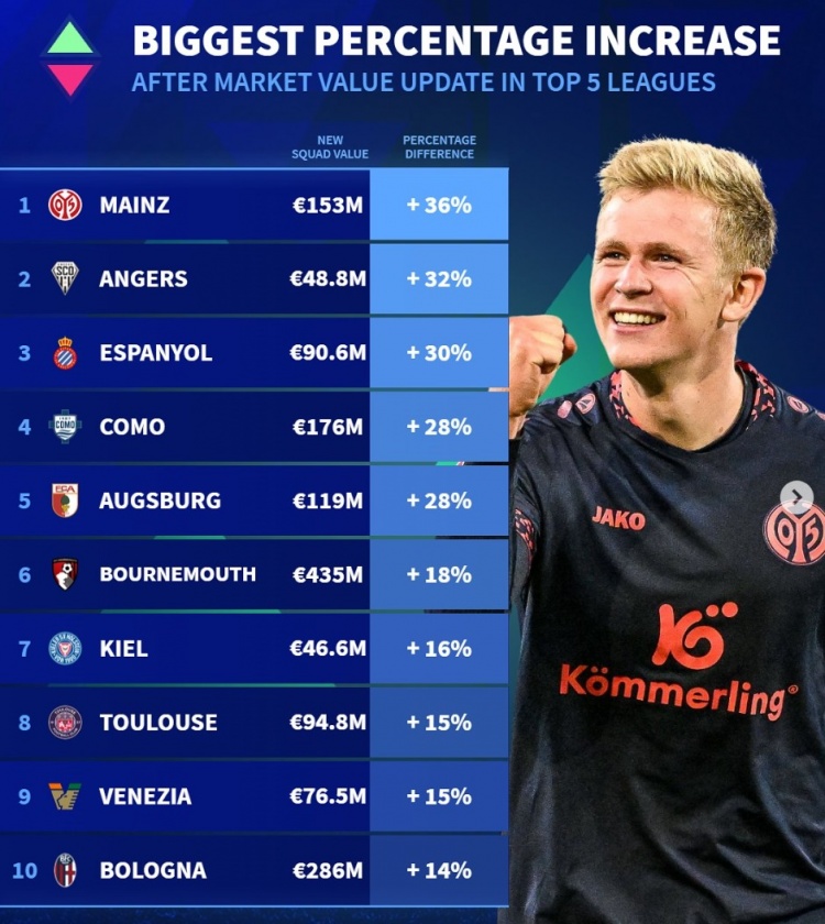 五大聯賽球隊身價升值比例:美因茨漲36%,博洛尼亞&伯恩茅斯在列