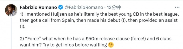 羅馬諾回復(fù)道:“第一,我提到懷森是因?yàn)樗_實(shí)是最佳聯(lián)賽中最為出色的年輕中衛(wèi),他得到西班牙隊(duì)的征召,然后上演了國家隊(duì)的首秀,并送出助攻。”
