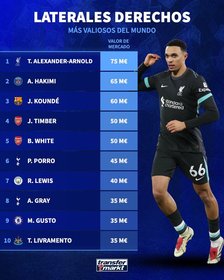 皇馬又免簽了個硬菜?德轉列右后衛(wèi)身價:阿諾德7500萬歐居首