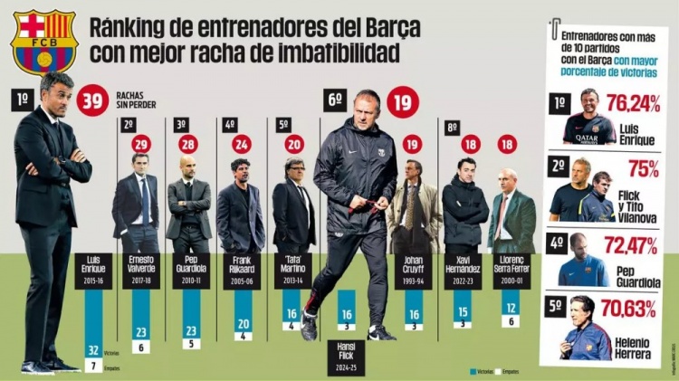 3月29日訊 巴薩在西甲補(bǔ)賽3-0完勝奧薩蘇納,延續(xù)了弗里克帶隊(duì)的出色表現(xiàn),《每體》統(tǒng)計(jì)顯示弗里克是巴薩隊(duì)史主帥連續(xù)不敗榜第6,并且總勝率僅次于恩里克。