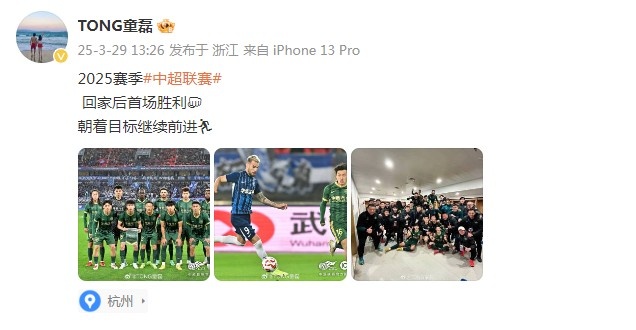 3月29日訊 在中超聯(lián)賽第3輪中,浙江隊客場4-0大勝武漢三鎮(zhèn),本場也是浙江隊在本賽季的首勝。比賽結(jié)束轉(zhuǎn)天,童磊更新微博,慶祝球隊取勝。