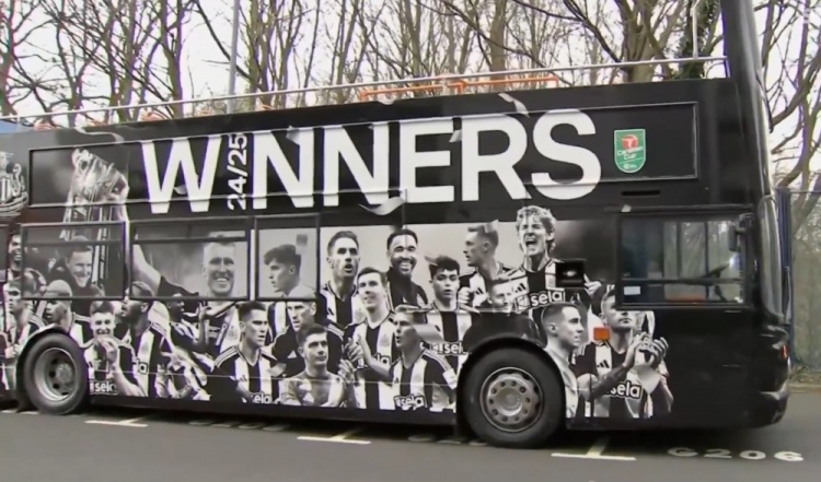 3月29日訊 紐卡斯?fàn)柦裉鞂⑦M(jìn)行聯(lián)賽杯奪冠游行慶祝,現(xiàn)在教練和球員們將乘坐的大巴已經(jīng)亮相。
