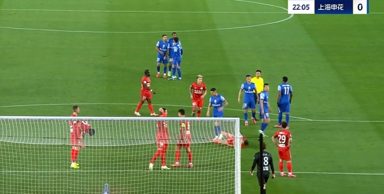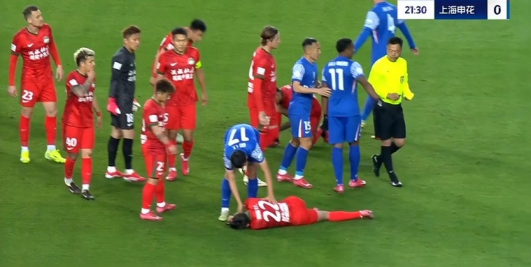 第23分鐘,申花左側(cè)角球機(jī)會,禁區(qū)內(nèi)卡位時路易斯故意推搡黃銳烽,后者倒地,主裁黃牌警告路易斯↓