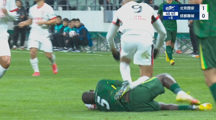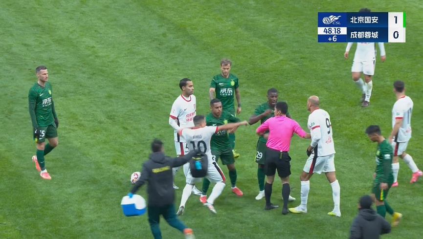 比賽上半場補時階段,費利佩倒地時踩到恩加德烏腹部,兩隊爆發(fā)沖突,馬寧趕緊拉開兩方球員。場上比分國安1-0蓉城。