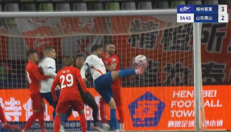03月29日訊 泰山vs梅州第55分鐘,泰山角球機會,澤卡倚人勾射破門,泰山再扳一球2-3落后梅州!