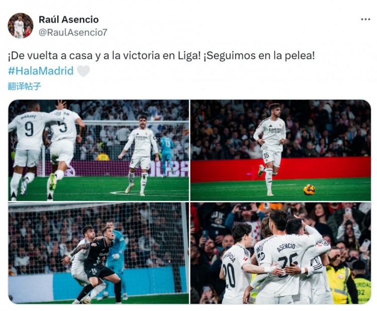 勞爾-阿森西奧社媒曬出比賽照片,并配文:“回到主場,在聯(lián)賽中取得勝利!我們?nèi)栽趹?zhàn)斗!”
