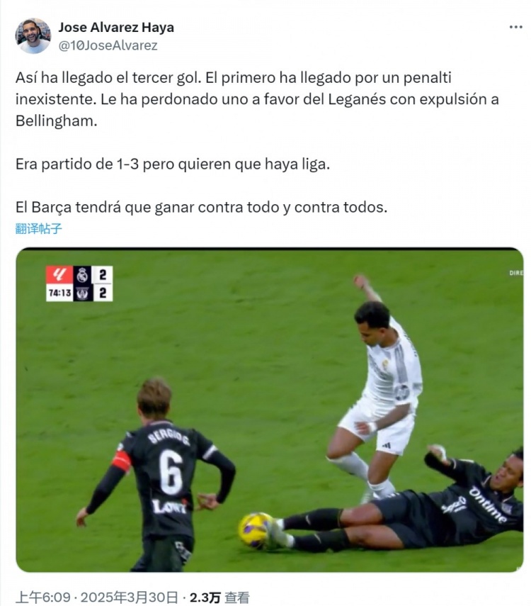 對(duì)此西班牙六臺(tái)巴薩跟隊(duì)記者Jose Alvarez Haya在社交媒體上寫(xiě)道:“伯納烏的丑聞,判罰了一個(gè)不存在的點(diǎn)球(指居勒爾倒地獲點(diǎn))。”