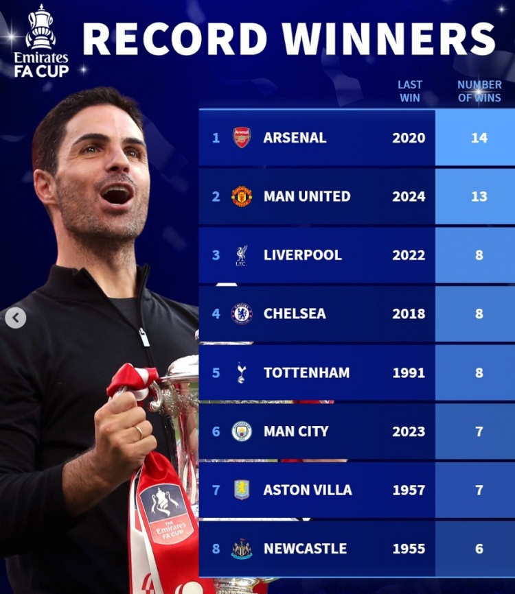 - 德轉(zhuǎn)列足總杯歷史奪冠榜:阿森納壓曼聯(lián)居首,曼城&維拉各7冠