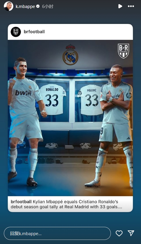 姆巴佩皇馬首秀賽季33球追平C羅!賽后其社媒轉(zhuǎn)發(fā)比肩偶像C羅的圖