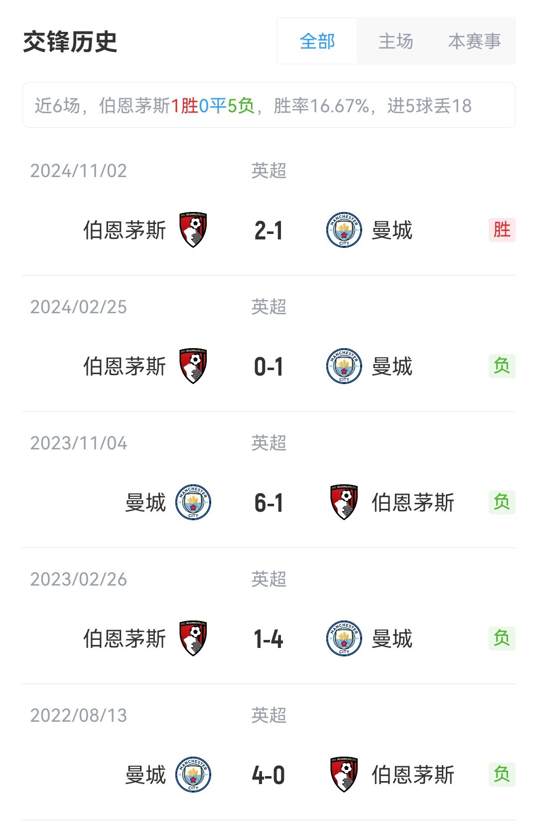 而在英超方面,曼城14勝6平9負(fù),積48分排名第5,伯恩茅斯則是12勝8平9負(fù),積44分排名第10。