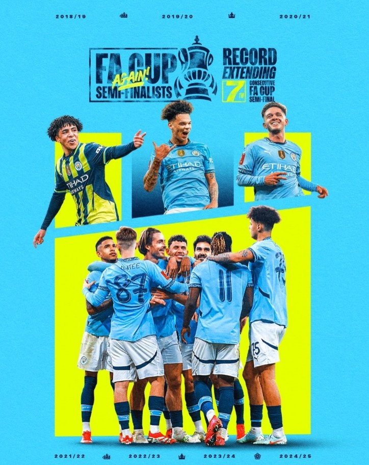 曼城連續(xù)7年晉級(jí)足總杯半決賽,創(chuàng)賽事歷史紀(jì)錄