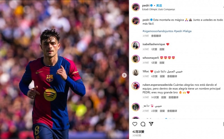 佩德里社媒感謝球迷:主場仿佛有魔力,有你們支持一切都更容易