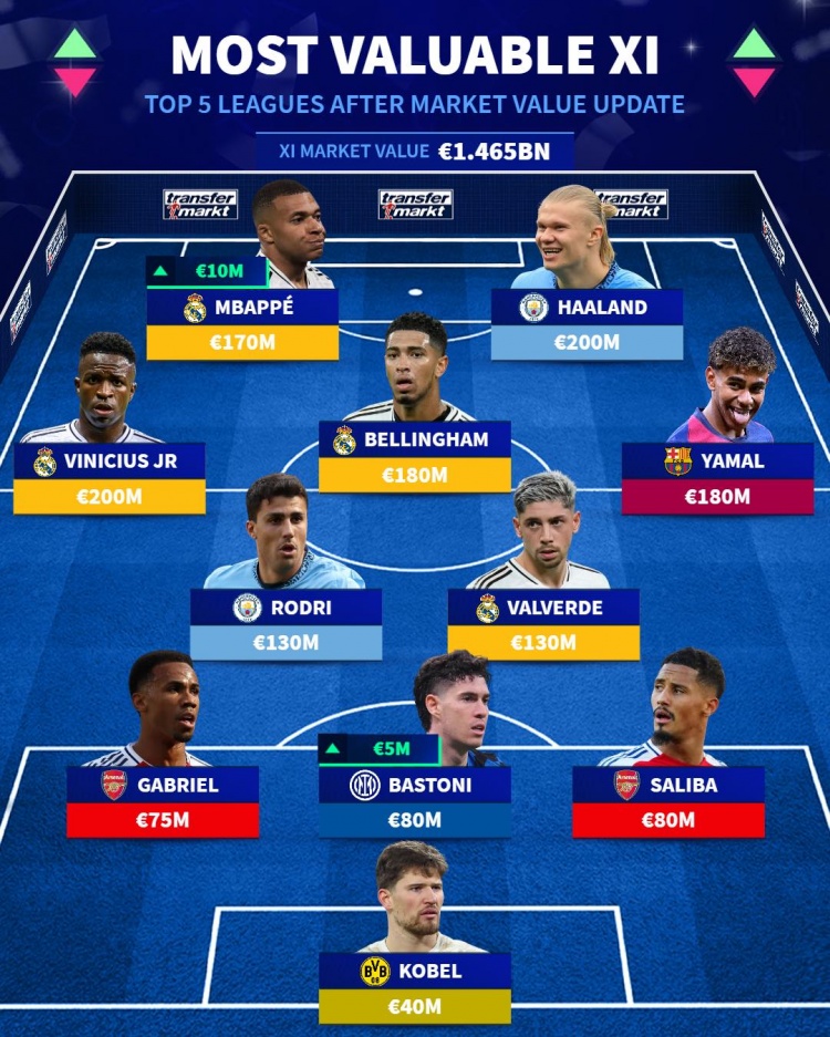 - 五大聯(lián)賽身價(jià)最高陣:哈蘭德、姆巴佩、亞馬爾在列,總價(jià)超14億歐