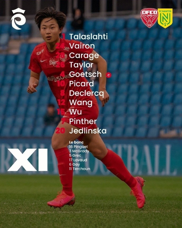 法甲第19輪第戎女足主場3-0戰(zhàn)勝南特女足,吳澄舒、王妍雯首發(fā)出場,第17分鐘,吳澄舒接隊友左路傳中,頭球破門,首開紀(jì)錄,連續(xù)兩場有進(jìn)球入賬。上輪聯(lián)賽第戎客場2-0戰(zhàn)勝勒阿弗爾女足,吳澄舒也斬獲一粒進(jìn)球。王妍雯打滿90分鐘,傷停補(bǔ)時階段被隊友換下。