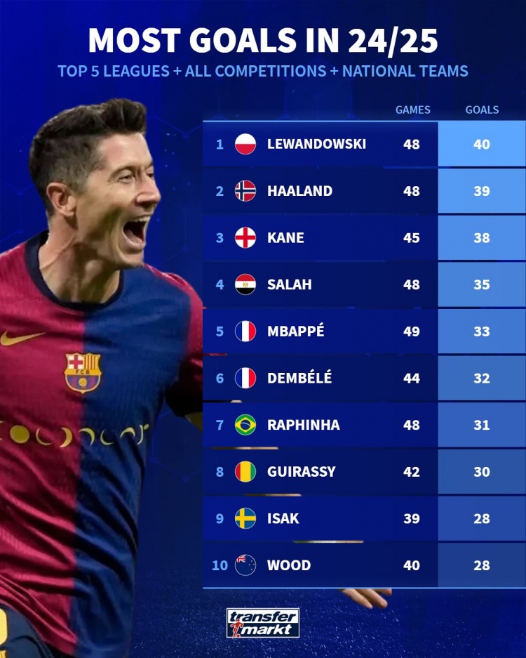 本賽季五大聯(lián)賽球員進(jìn)球榜:36歲萊萬40球居首,哈蘭德、凱恩前三