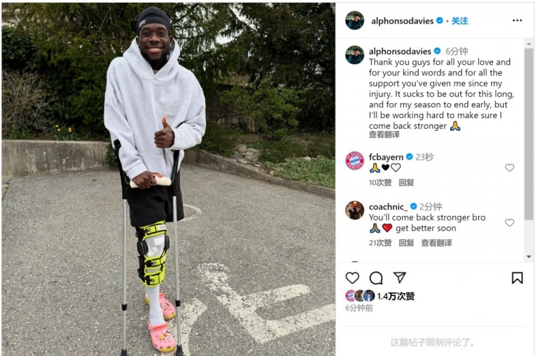 3月31日訊 拜仁后衛(wèi)戴維斯更新社媒動態(tài),感謝球迷對他的支持和祝福,并確認(rèn)賽季報銷。