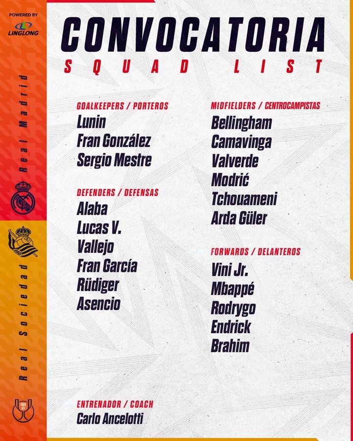 3月31日訊 北京時間4月2日周三凌晨3點30分,皇家馬德里將在國王杯半決賽次回合主場對陣皇家社會,首回合皇馬1-0取勝,今天皇馬公布了次回合比賽日名單,具體如下: