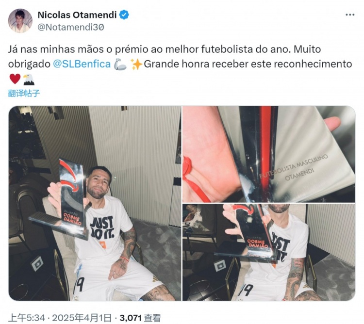 37歲奧塔門迪當選本菲卡年度最佳球員,社媒曬手拿獎杯照片