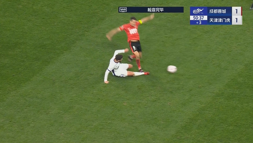 【判例二】:中超聯(lián)賽第2輪,成都蓉城VS天津津門(mén)虎,比賽第45+3分鐘,成都蓉城8號(hào)隊(duì)員在爭(zhēng)搶球時(shí)疑似踩踏天津津門(mén)虎8號(hào)隊(duì)員,裁判員未判罰犯規(guī),VAR介入,裁判員經(jīng)在場(chǎng)回看后,判罰成都蓉城8號(hào)隊(duì)員嚴(yán)重犯規(guī),并向其出示紅牌罰令出場(chǎng)。