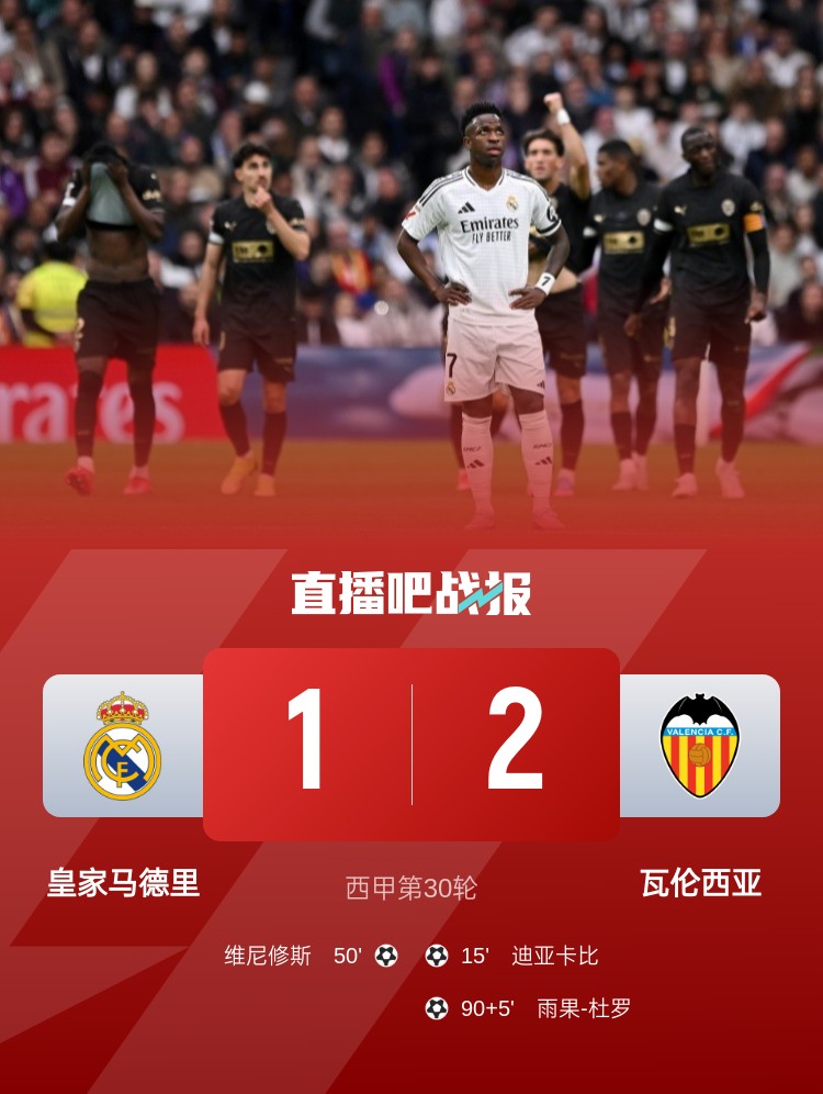 西甲第30輪,皇馬1-2瓦倫西亞,聯(lián)賽三連勝終結(jié)。上半場,姆巴佩造點,維尼修斯罰丟,迪亞卡比頭球破門;下半場,貝林厄姆助攻維尼修斯扳平,瑪瑪達什維利神撲,雨果-杜羅補時絕殺。