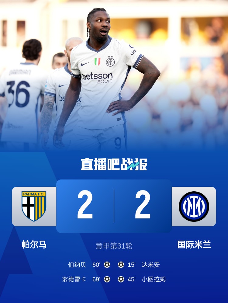 意甲第31輪,國米客場2-2帕爾馬。上半場,達米安勁射破門,小圖拉姆搶點建功;下半場,伯納貝遠射扳回一城,翁德雷卡抽射變線入網(wǎng)扳平。