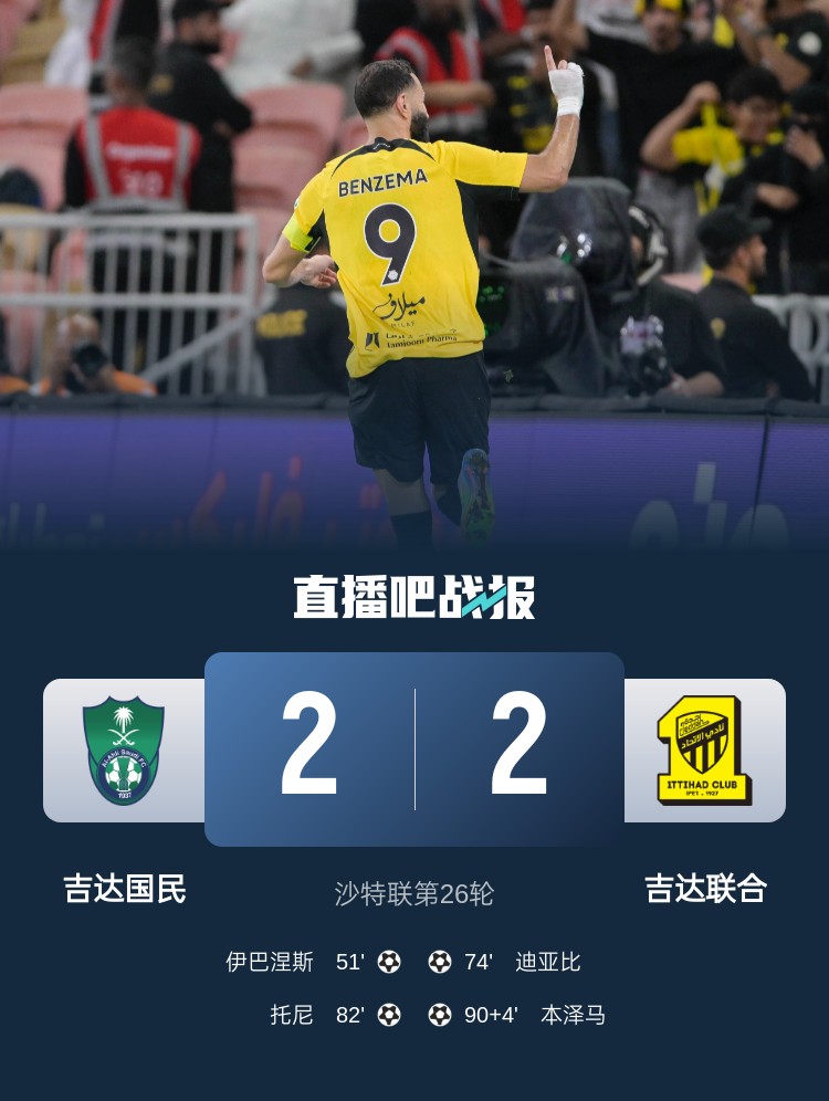 沙特聯(lián)第26輪,吉達聯(lián)合2-2吉達國民仍5分領(lǐng)跑。上半場,馬赫雷斯遠射造險,托尼禁區(qū)被薩德放倒裁判沒表示,吉達聯(lián)合0射正;下半場,坎特失空門,伊巴涅斯頭球破僵,迪亞比推射破門扳平,坎特烏龍助攻托尼抽射反超,本澤馬補時絕平。