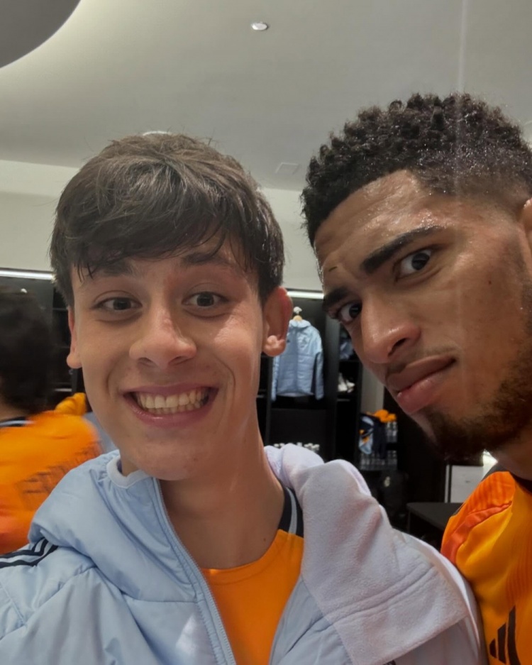 卡馬文加曬出自己與維尼修斯的合照并寫(xiě)道:“和隊(duì)長(zhǎng)維尼修斯(后面還有莫德里奇、巴斯克斯、塞巴略斯和巴爾韋德)以及攝影師的照片????”