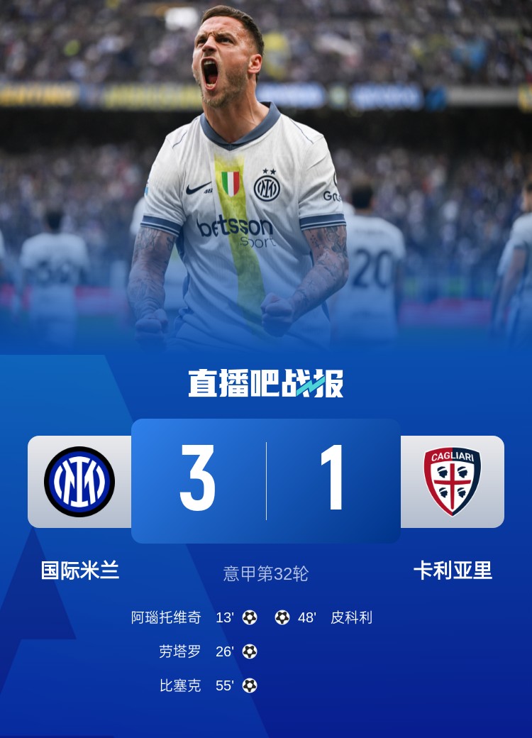 意甲第32輪,國(guó)米3-1卡利亞里,阿瑙托維奇?zhèn)魃?,勞塔羅進(jìn)球。