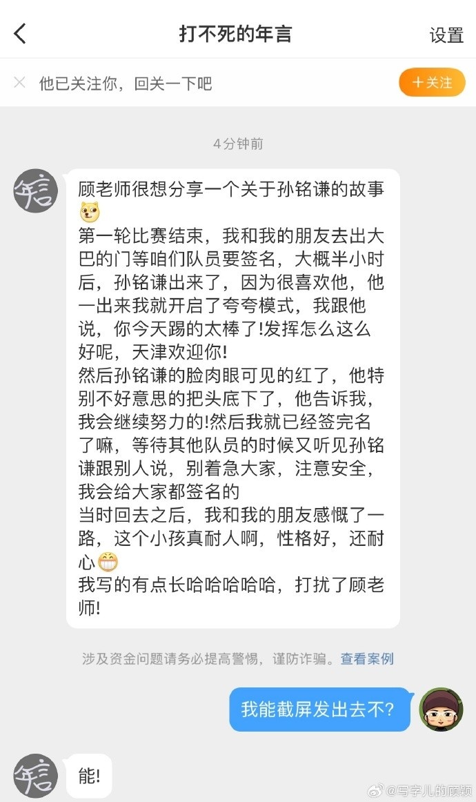 3月7日訊 今天,天津記者顧穎在社媒分享了一名球迷與津門虎球員孫銘謙之間的小故事。