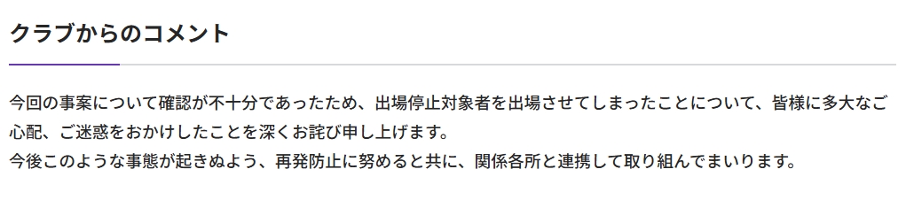 廣島三箭俱樂部官方寫道:“由于我們對此事件調(diào)查不充分,導(dǎo)致被禁賽的球員仍然參賽,給大家?guī)砹藫?dān)憂與不便,我們深表歉意。