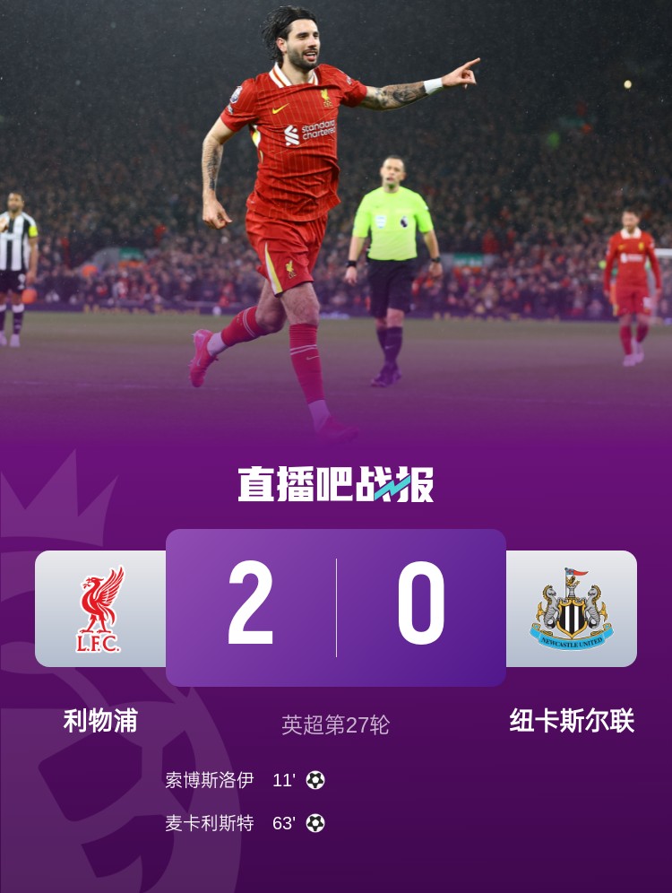 多賽1場13分領跑!利物浦2-0紐卡聯(lián)賽24輪不敗 索博&麥卡建功