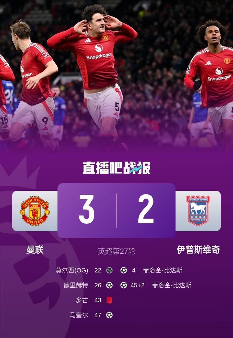 多古送禮+染紅,馬奎爾頭球破門,曼聯(lián)3-2逆轉伊普斯維奇。