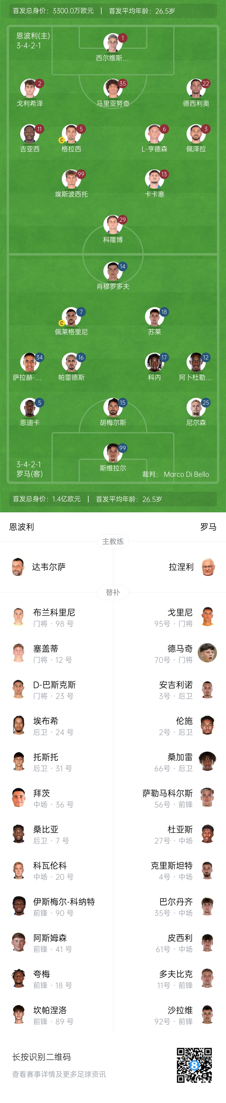 恩波利替補(bǔ):98-布蘭科里尼、12-塞蓋蒂、23-德維斯-巴斯克斯、24-埃布希、31-托斯托、36-拜茨、7-桑比亞、20-科瓦倫科、90-伊斯梅爾-科納特、41-阿斯姆森、18-夸梅、89-坎帕涅洛