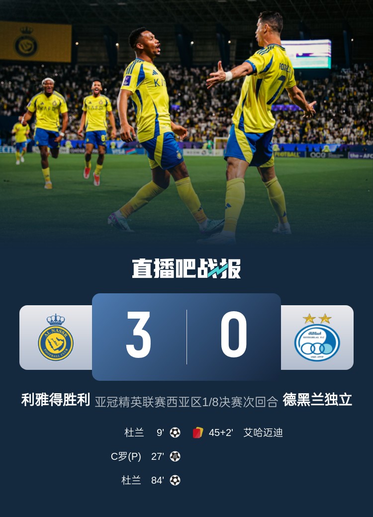 亞冠精英聯(lián)賽西亞區(qū)1/8決賽次回合,C羅進(jìn)球,杜蘭梅開二度,利雅得勝利3-0德黑蘭獨(dú)立,晉級亞冠八強(qiáng)。