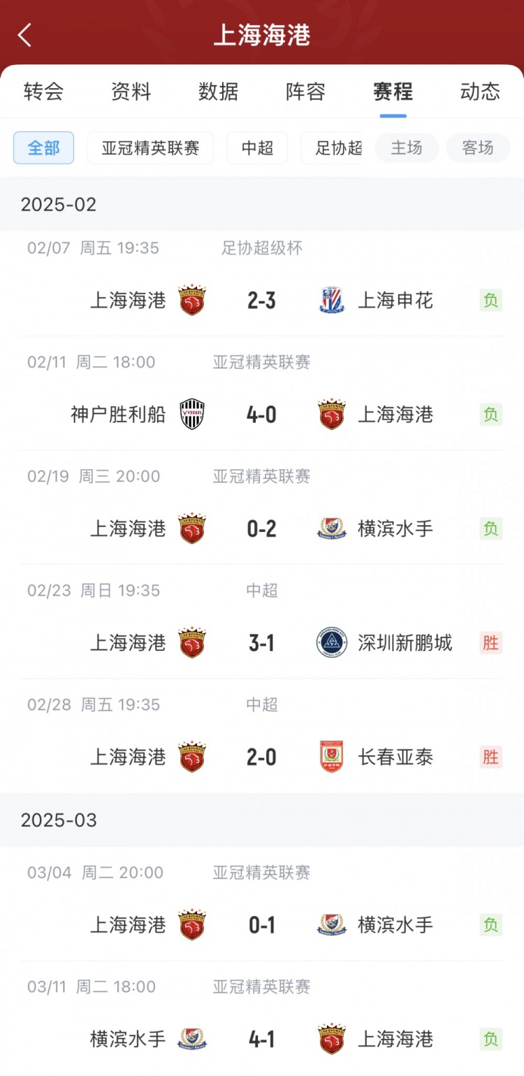 這7場(chǎng)比賽中,海港隊(duì)輸?shù)袅似渲?場(chǎng),這造成球隊(duì)痛失超級(jí)杯冠軍,以及在亞冠精英聯(lián)賽止步于16強(qiáng)。不過在中超聯(lián)賽中,海港隊(duì)取得連勝,且2場(chǎng)聯(lián)賽僅失1球。